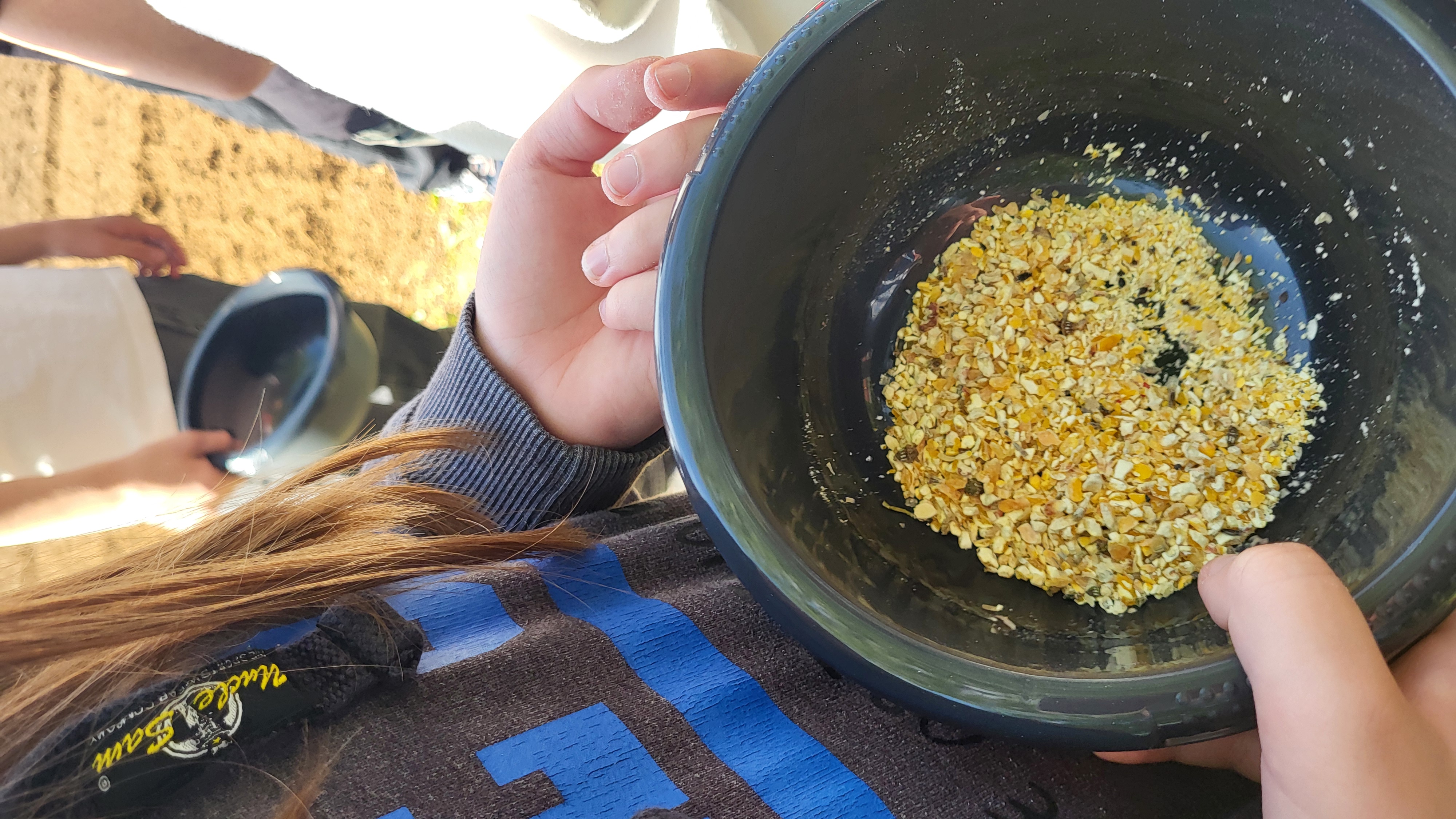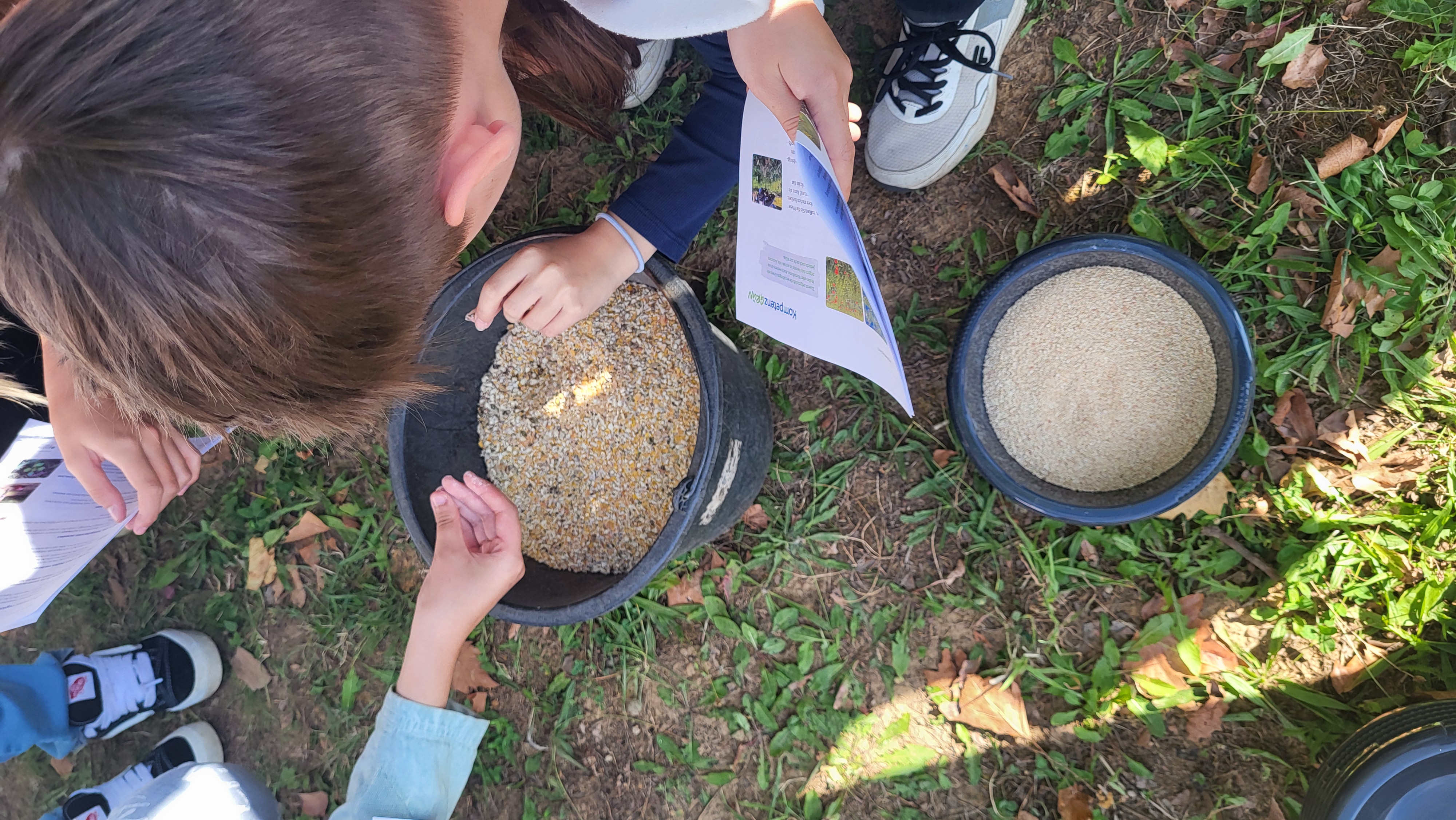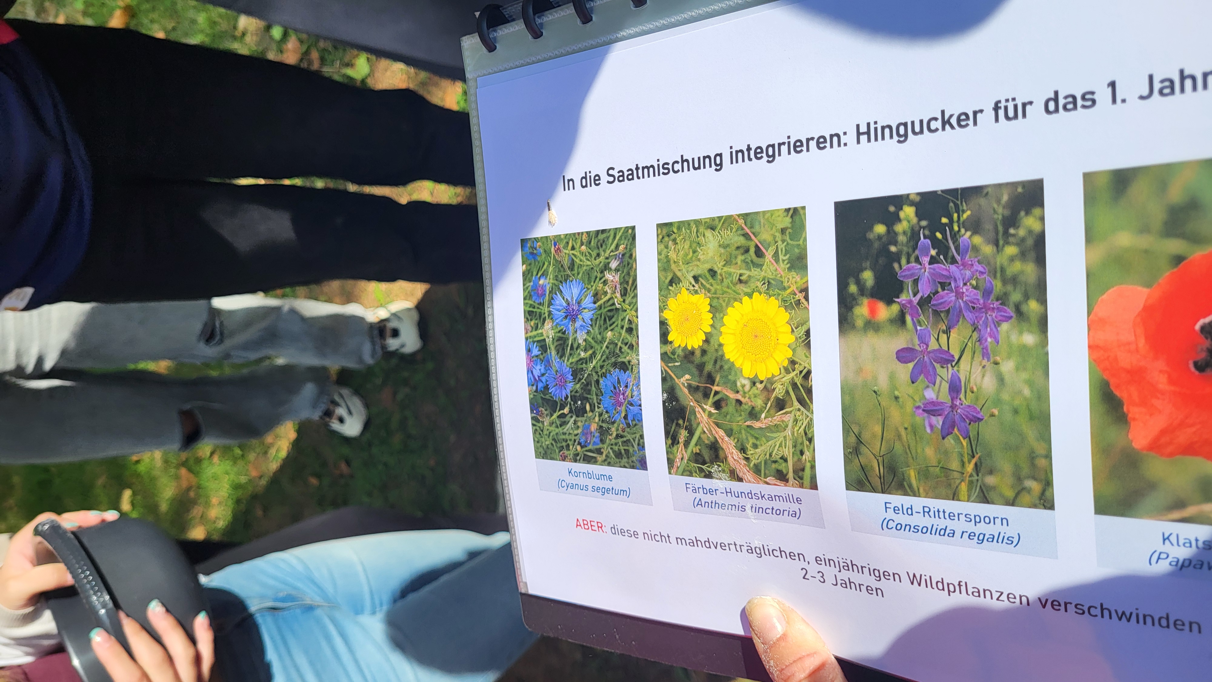 Die Pflanzen, die wir aussäten waren Lichtkeimer, das heißt, sie brauchen unbedingt die direkte Sonneneinstrahlung. Das Saatgut befand sich zwischen zermahlenen Maiskörnern. Dadurch konnte es besser auf die Fläche geworfen werden und oberflächlich gut aufrieseln. Im Anschluss pflanzten wir auch direkt Wildkräuter ein. Auch das hat uns großen Spaß gemacht.